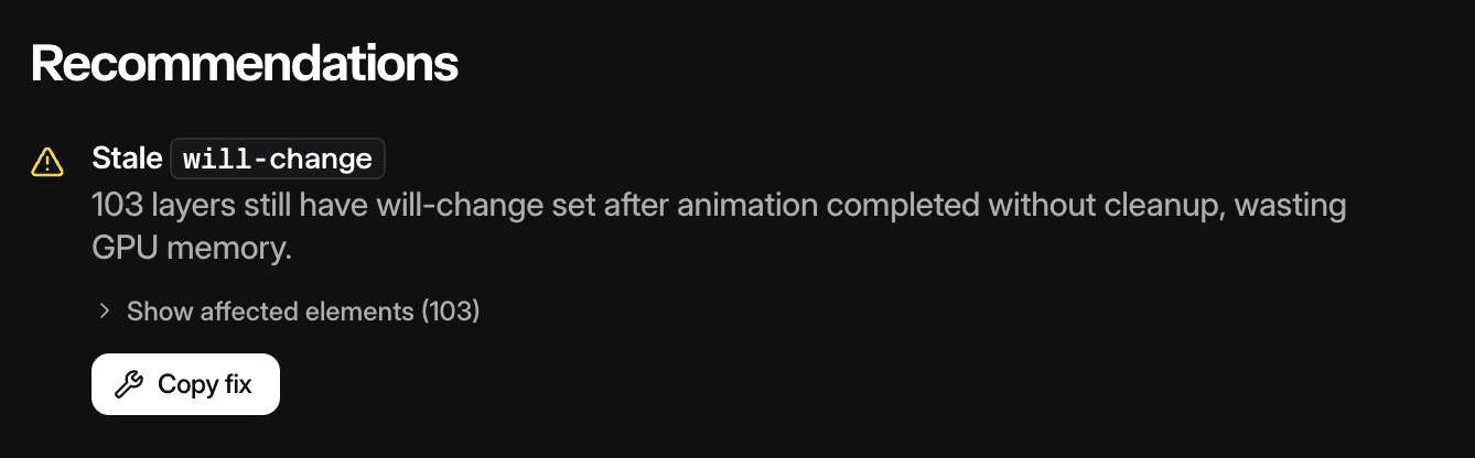 Many findings include a Copy fix button. Clicking it copies a structured prompt to your clipboard that you can paste into any LLM (ChatGPT, Claude, Copilot, etc.). The prompt includes the problem description, affected element selectors, and a targeted fix strategy so the LLM can generate the specific code changes needed for your project.