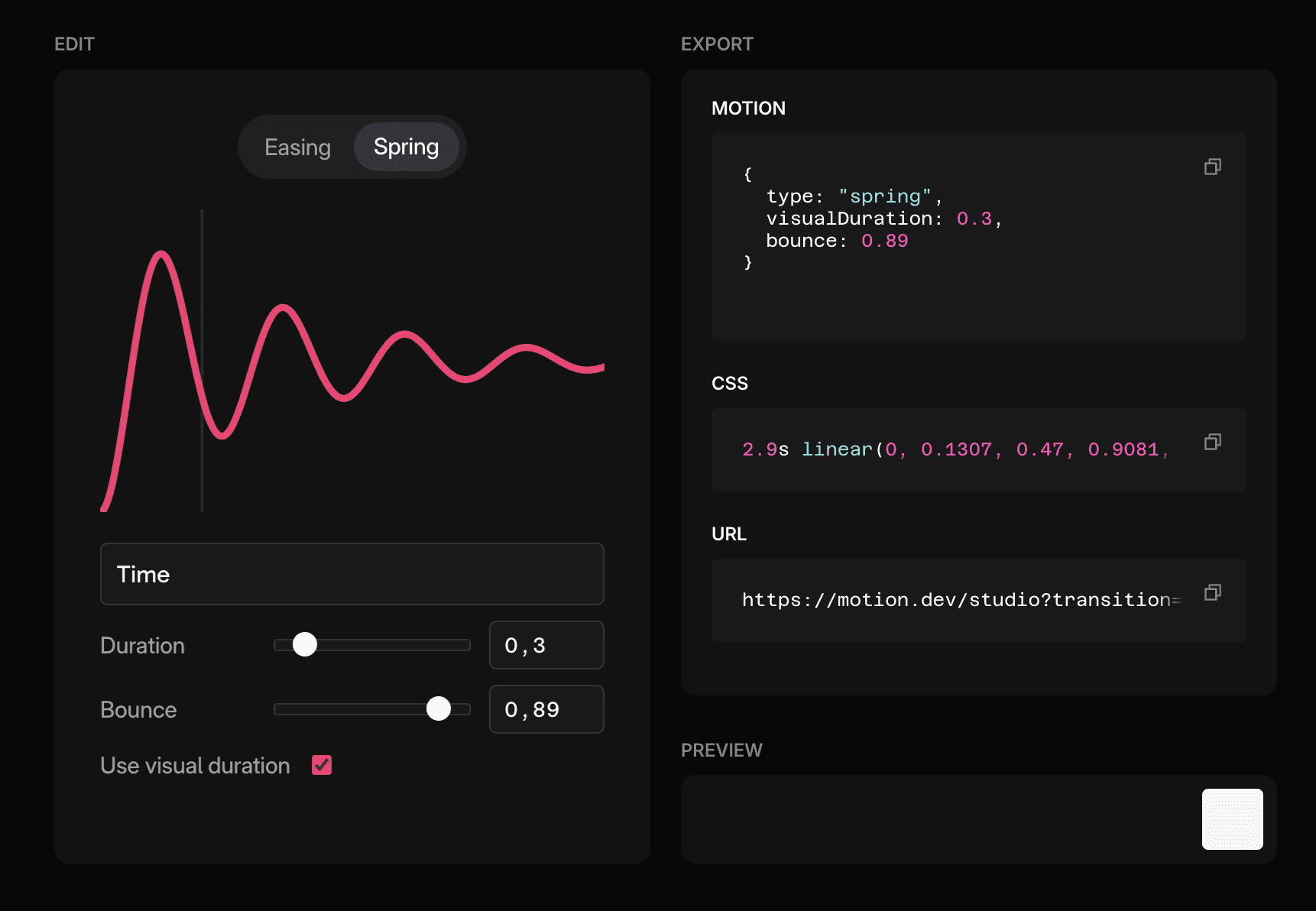 This is improved somewhat with the Motion Studio MCP, which sits in your code editor and lets your LLM generate CSS linear() curves using Motion's spring generator and bounce easing function. In a future iteration of the Motion Studio Extension you'll be able to do this via the GUI, too.